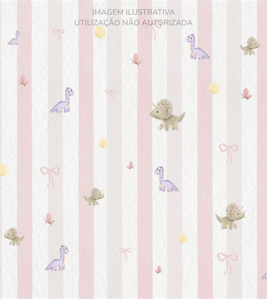 Enquanto muitas estampas de dinossauros são pensadas para meninos, nós criamos esta arte para mudar isso e apresentar um cenário doce e aventureiro focado nas meninas. A arte reúne dinossauros amigáveis, laços e borboletas entre listras em tons rosa e off-white, equilibrando delicadeza e imaginação em cada detalhe.