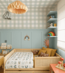 Você também pode aplicar o papel de parede no teto e transformar o espaço por completo. Esse uso criativo amplia o ambiente e cria um efeito visual encantador, tornando o quarto ainda mais especial.